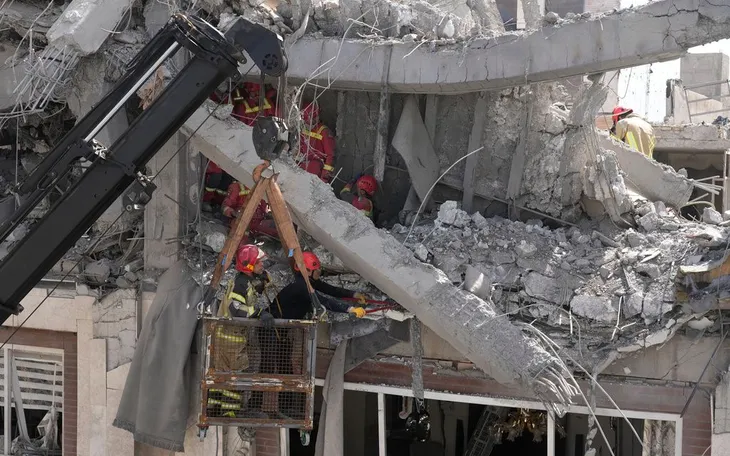 Đống đổ nát của một tòa chung cư bị trúng bom trong cuộc không kích của Mỹ và Israel ở Tehran, Iran, ngày 27/3/2026 (Ảnh: AP)