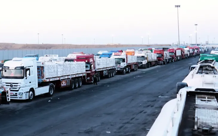 Xe tải chở hàng viện trợ chờ kiểm tra để vào Dải Gaza tại cửa khẩu Rafah, ngày 20/10/2025 (Ảnh: AP)