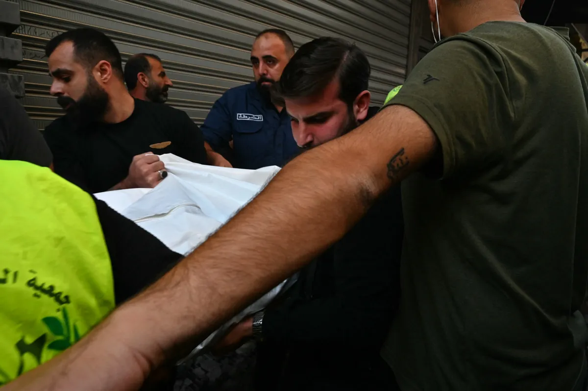 Lực lượng cứu hộ đưa một thi thể ra khỏi đống đổ nát của một tòa nhà ở Haret Hreik, ngày 23/11/2025 (Ảnh: AFP)