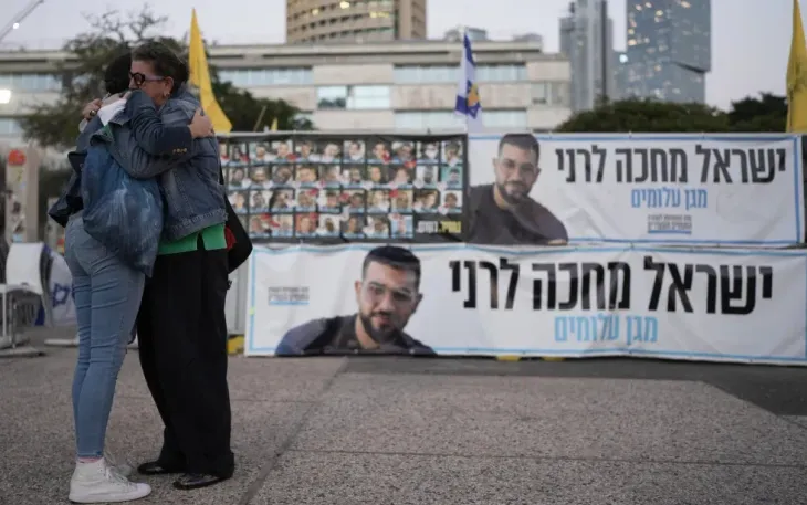 Người dân ôm nhau tại Quảng trường Con tin ở Tel Aviv sau khi Israel xác nhận danh tính thi thể con tin Ran Gvili, ngày 26/1/2026 (Ảnh: AP)