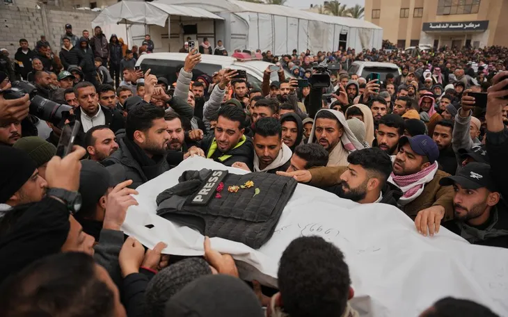 Người dân đưa tang ông Abd Shaat, một trong ba nhà báo Palestine thiệt mạng trong một cuộc tấn công của Israel nhằm vào xe của một ủy ban Ai Cập, ngày 22/1/2026 (Ảnh: AP)