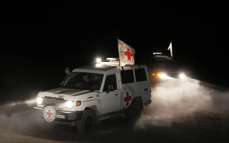 Xe của Hội Chữ thập đỏ vận chuyển thi thể của 3 con tin do Hamas bàn giao (Ảnh: AP)