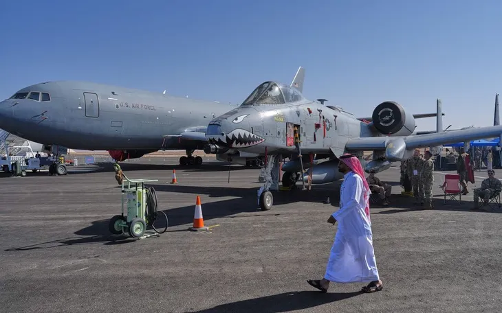 Khách tham quan đi qua máy bay cường kích A-10 Thunderbolt II của Không quân Mỹ trưng bày tại Triển lãm Quốc phòng thế giới ở Riyadh ngày 8/2/2026. (Ảnh: AP)