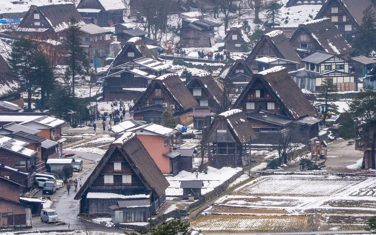 Bầu trời cuối năm không được trong trẻo mà khoác lên mình một lớp áo xám tro đặc trưng của dải núi Alps Nhật Bản. Thế nhưng, chính cái không khí âm u, se lạnh ấy lại làm tôn lên vẻ đẹp trầm mặc, hoài cổ của nơi đây. Tuyết cuối năm đã rải một lớp mỏng, phơn phớt ôm lấy những mái nhà tranh chứ chưa vùi lấp hẳn các con đường. Nhờ vậy, đôi chân từ vùng nhiệt đới của chúng tôi vẫn có thể thong thả dạo bước quanh làng mà không bị ngập sâu trong tuyết trắng.
