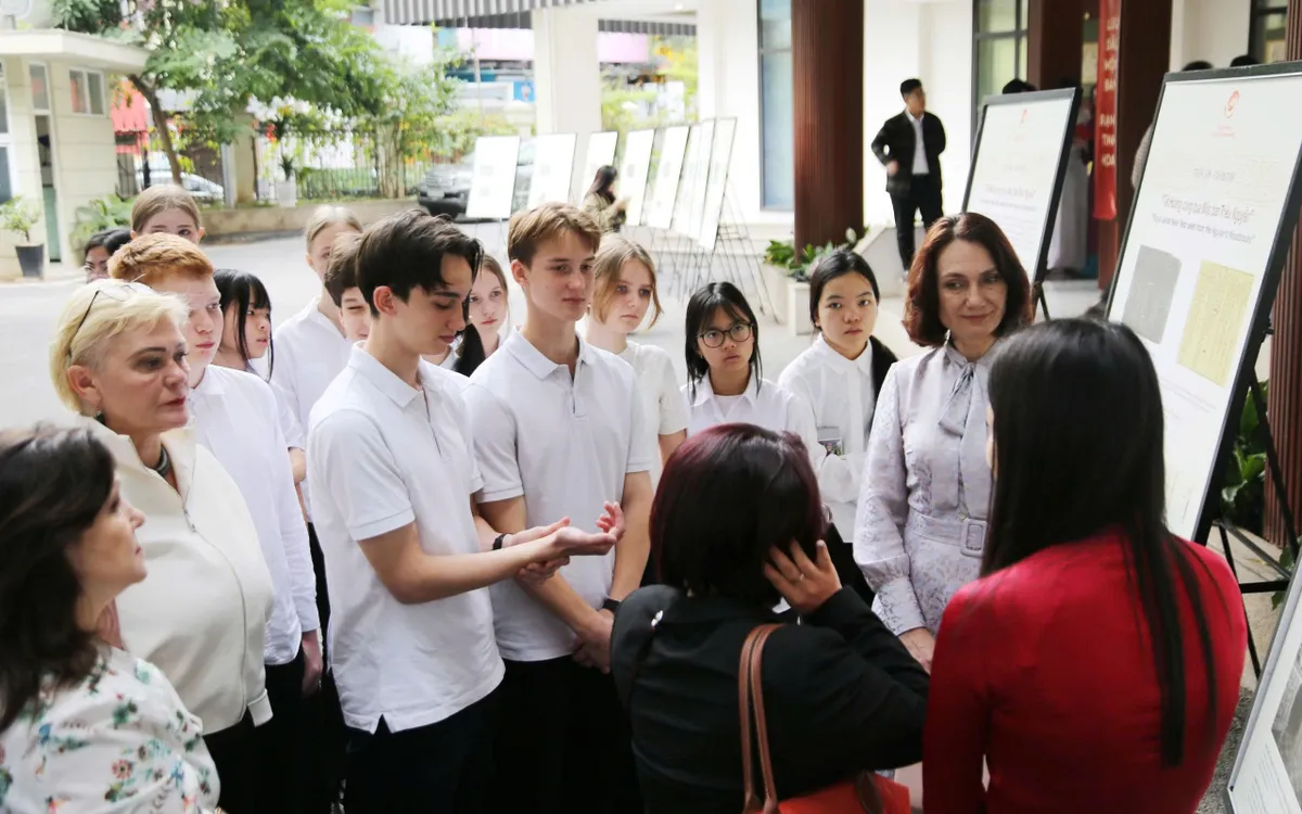 Học sinh trường Đại sứ quán Nga tại Việt Nam tìm hiểu về văn hóa Việt Nam qua các tài liệu lưu trữ quốc gia.