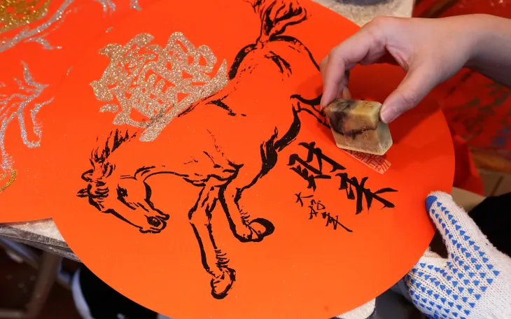 Một nghệ nhân đóng dấu lên đồ trang trí truyền thống phục vụ Tết Nguyên đán tại chợ Dihua ở Đài Bắc, Đài Loan (Trung Quốc), ngày 15/2/2026 (Ảnh: AP)