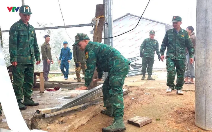 Các lực lượng cùng tham gia giúp các hộ dân bị thiệt hại do mưa đá, giông lốc. Ảnh: Đức Duẩn