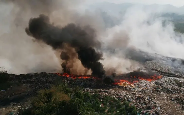 Bãi rác dốc Đá Mài, xã Cát Tiên (Lâm Đồng) cháy ngùn ngụt, khói bốc cao kèm mùi hôi thối nồng nặc.