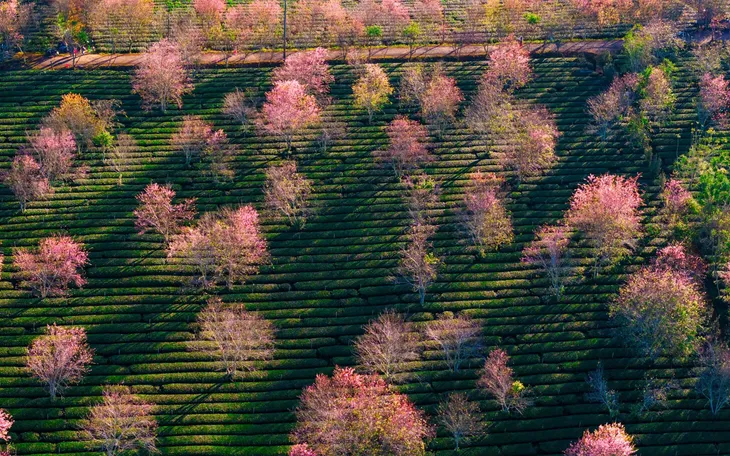 Dọc theo các triền dốc dẫn vào đồi chè hay xen kẽ giữa những nương cà phê xanh ngát, sắc hồng phấn đã bắt đầu hiện diện. Không rực rỡ và dày đặc như thời điểm chính vụ, hoa đầu mùa mang vẻ đẹp mỏng manh, lác đác điểm xuyết trên nền xanh của núi đồi, tạo nên khung cảnh giao mùa đặc trưng của phố núi.
