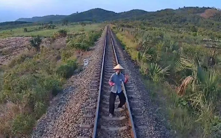 Camera tàu hỏa ghi lại hình ảnh người phụ nữ đứng giữa đường ray.