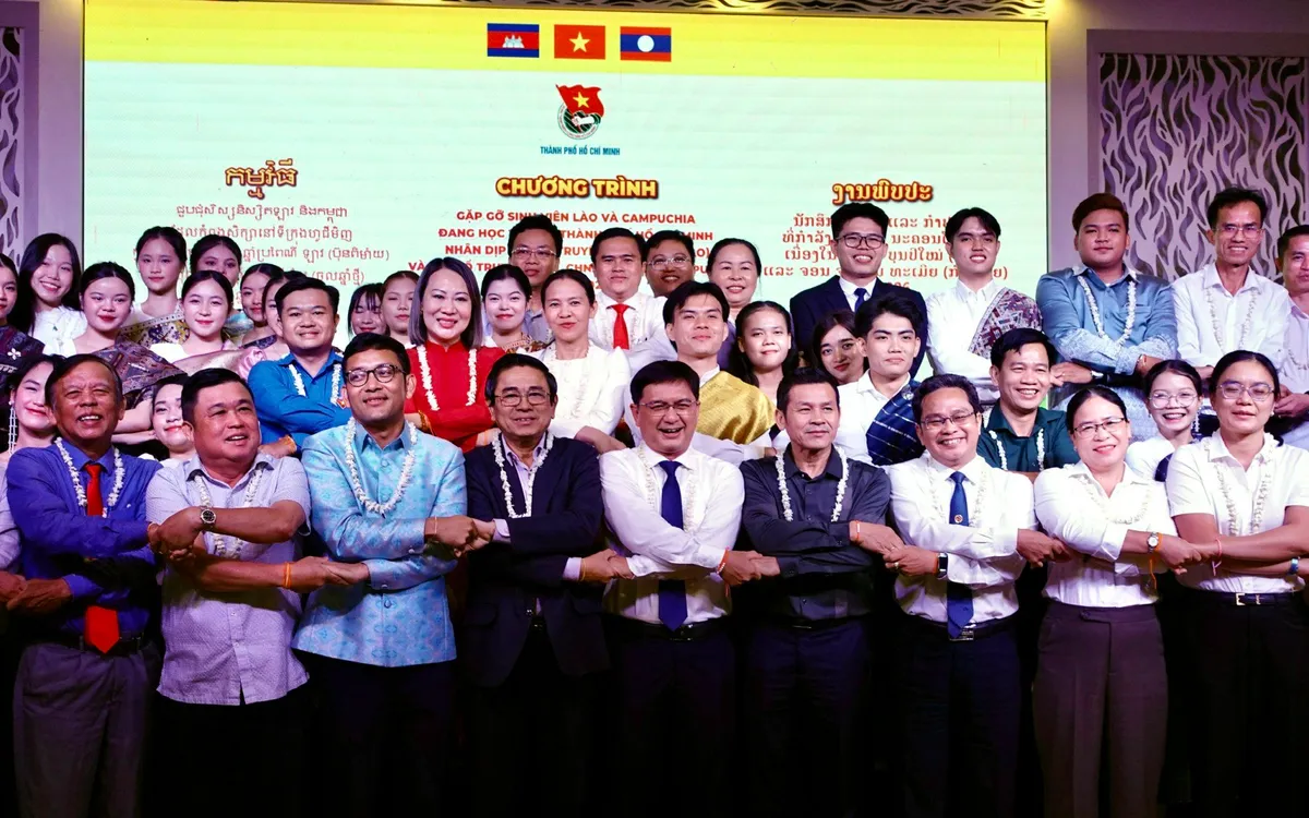 Lãnh đạo TP Hồ Chí Minh chụp hình lưu niệm cùng lãnh sự và đại diện sinh viên Lào, Campuchia thể hiện mối quan hệ bền chặt giữa 3 quốc gia