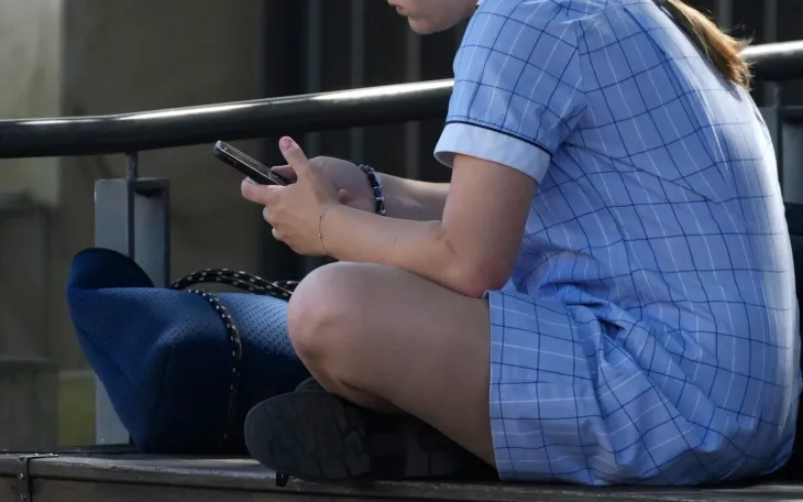 Một thiếu nữ sử dụng điện thoại khi ngồi trên ghế tại Sydney ngày 8/11/2024. (Ảnh: AP)