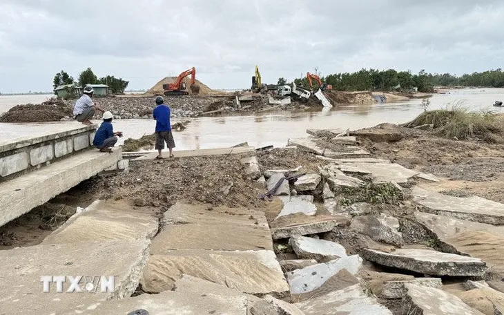 Bờ kè sông Ba đoạn qua xã Tây Hòa bị dòng nước lũ cuốn trôi, gây hư hại một số đoạn. (Ảnh: Tường Quân/TTXVN)