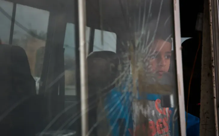 Cậu bé cùng gia đình chạy khỏi các cuộc không kích của Israel trú trong xe tại Sidon, Lebanon, ngày 2/4/2026. (Ảnh: AP)