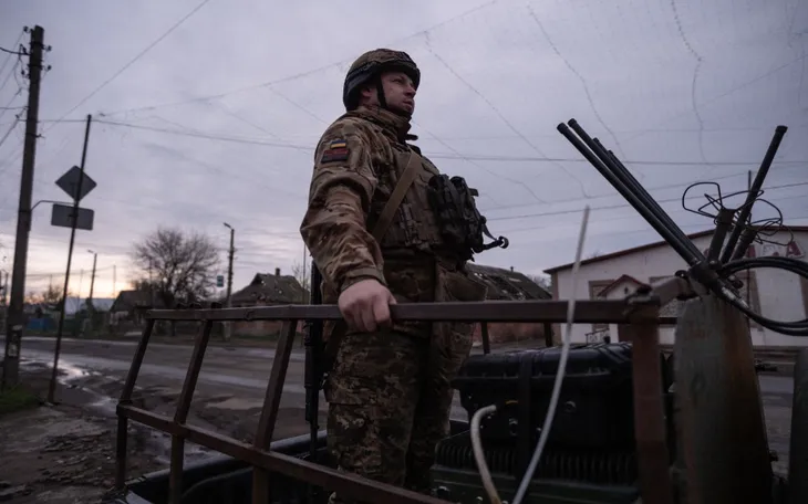 Một binh sĩ Ukraine đứng dưới lưới chống drone tại khu vực gần Druzhkivka, Donetsk, ngày 7/4/2026. (Ảnh: AFP)