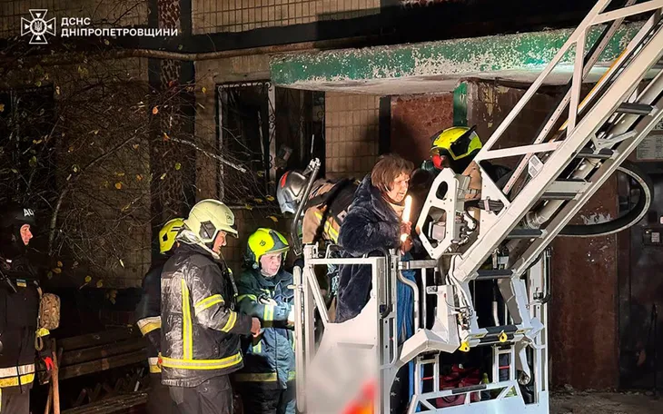 Lực lượng cứu hỏa sơ tán dân từ một chung cư cao tầng bị trúng hỏa lực của Nga, ở Dnipro, Ukriane (Ảnh: Ukrainian Emergency Service/AP)