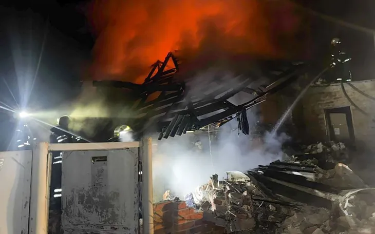Nhân viên cứu hộ nỗ lực dập tắt đám cháy tại một ngôi nhà riêng sau cuộc không kích của Nga ở Bohodukhiv, vùng Kharkov, Ukraine, ngày 11/2/2026 (Ảnh: AP)