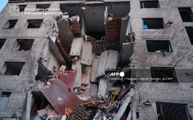 Tòa nhà bị hư hại nặng nề sau một cuộc tấn công của lực lượng Nga tại Zaporizhzhia hồi tháng 10/2025 (Ảnh: AFP)