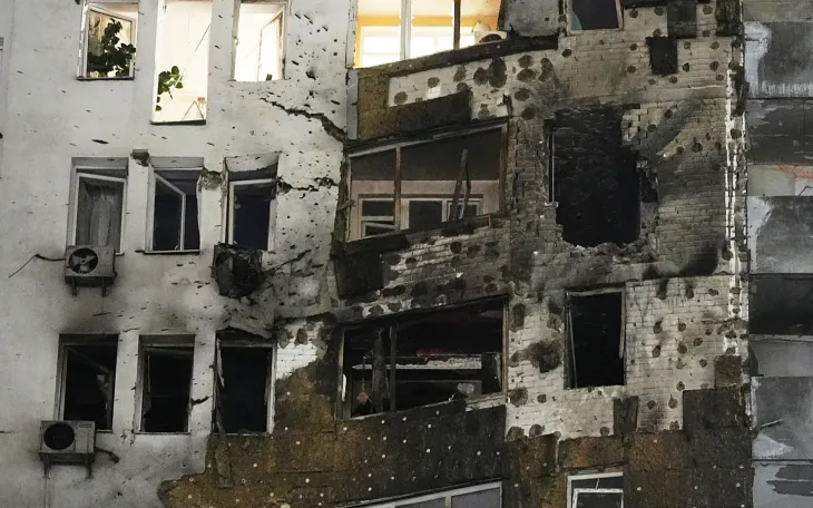 Một tòa nhà dân cư ở Ukraine hư hại do trúng không kích của lực lượng Nga (Ảnh: AP)