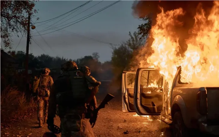 Binh sĩ Ukraine bên một chiếc xe bị UAV của Nga tấn công ở Kostiantynivka, Donetsk, ngày 16/12/2025 (Ảnh: Kyiv Independent)