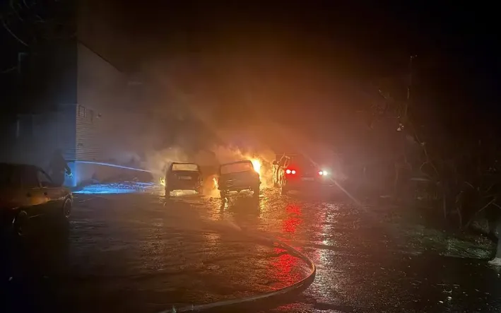Nhân viên dịch vụ khẩn cấp dập tắt đám cháy sau cuộc tấn công của Nga tại Balakliya, vùng Kharkov, ngày 17/11/2025 (Ảnh: AP)