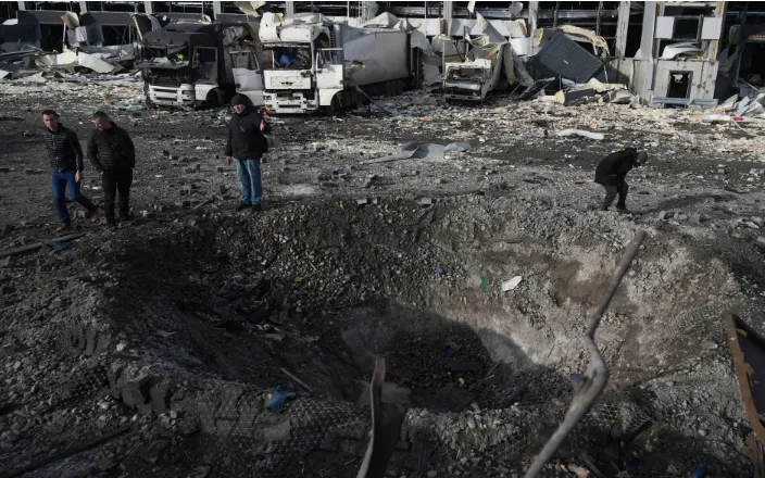 Hố bom bên cạnh trung tâm hậu cần siêu thị Novus bị hư hại nặng nề sau cuộc tấn công của Nga tại Kiev, Ukraine, ngày 25/11/2025 (Ảnh: AFP/Getty Images)