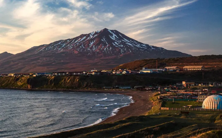 Một ngọn núi lửa trên đảo Iturup - hòn đảo lớn nhất trong quần đảo Kuril, nơi có khoảng 7.000 người sinh sống (Ảnh: TASS)