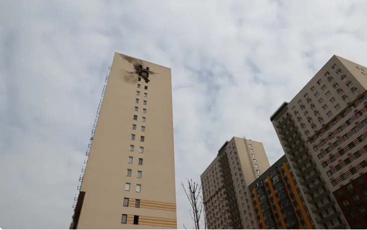 Tòa chung cư bị hư hại sau cuộc tấn công UAV của Ukraine ở Sapronovo, vùng Moscow, Nga (Ảnh: Tân Hoa Xã/Getty Images)