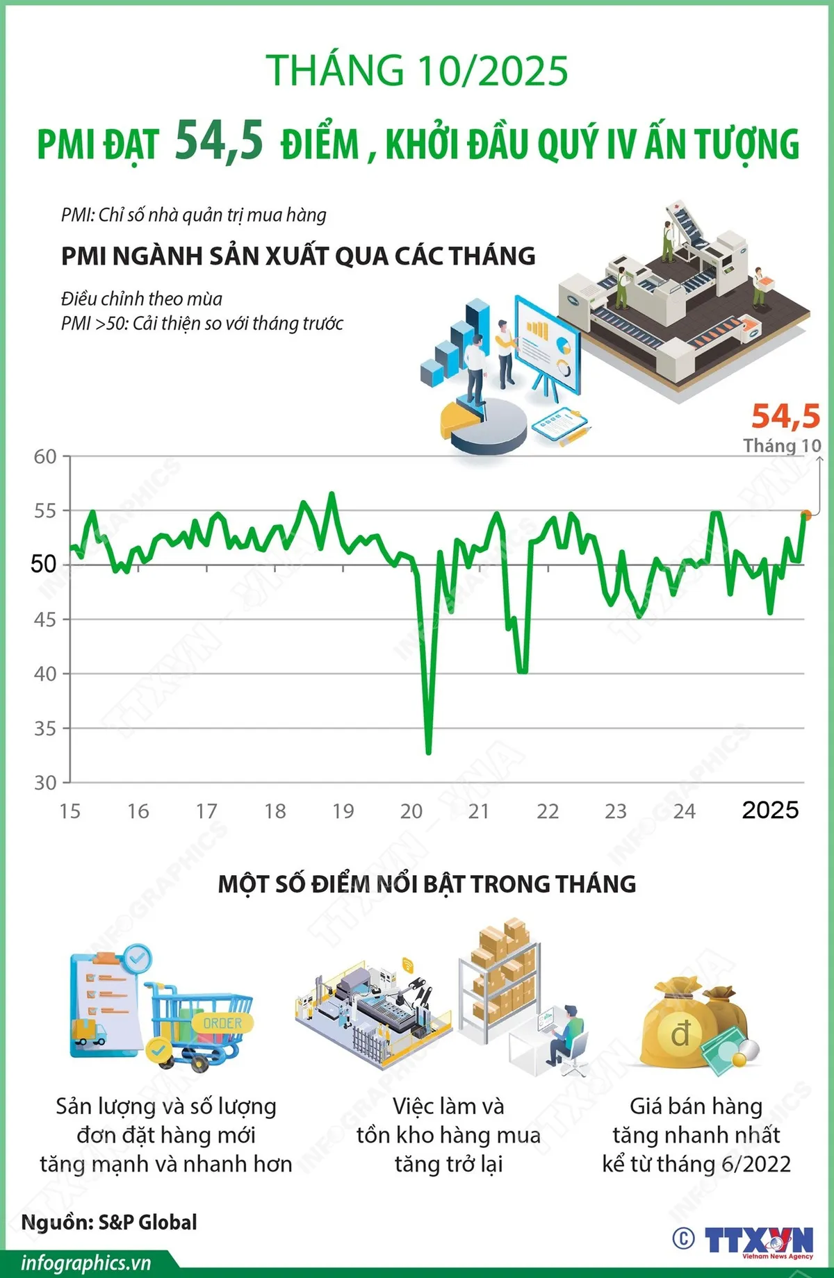 Chỉ số Nhà quản trị mua hàng (PMI) ngành sản xuất Việt Nam đã tăng lên 54,5 điểm trong tháng 10, tăng đáng kể so với 50,4 điểm của tháng 9, cho thấy sức khỏe ngành sản xuất cải thiện mạnh mẽ so với tháng trước. Trên thực tế, các điều kiện kinh doanh đã mạnh lên với mức độ lớn nhất kể từ tháng 7/2024.