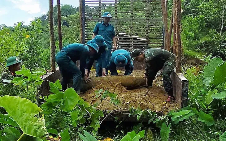 Ban Công binh Bộ CHQS tỉnh Nghệ An cùng các lực lượng phối hợp vận chuyển quả bom đến khu vực hủy nổ. Ảnh Trọng Kiên.