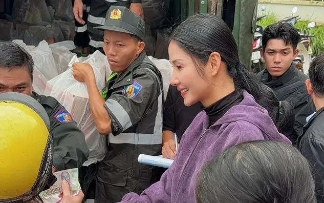 Á hậu Hoàng Thùy bay từ Hà Nội vào Khánh Hoà, ủng hộ 70 triệu đồng cùng nhiều phần quà cho người dân vùng lũ và các chiến sĩ cứu trợ. Cô cho biết được Trung đoàn Cảnh sát Cơ động Nam Trung Bộ hỗ trợ và đồng hành trong suốt hành trình, giúp chuyến đi bớt vất vả, đồng thời bảo đảm nhu yếu phẩm và tiền mặt được trao tận tay bà con.