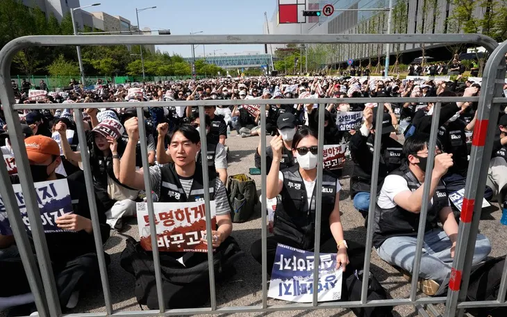 Công nhân Samsung hô khẩu hiệu đòi tăng thưởng tại khu phức hợp chip ở Pyeongtaek, Hàn Quốc, ngày 23/4/2026. (Ảnh: AP)