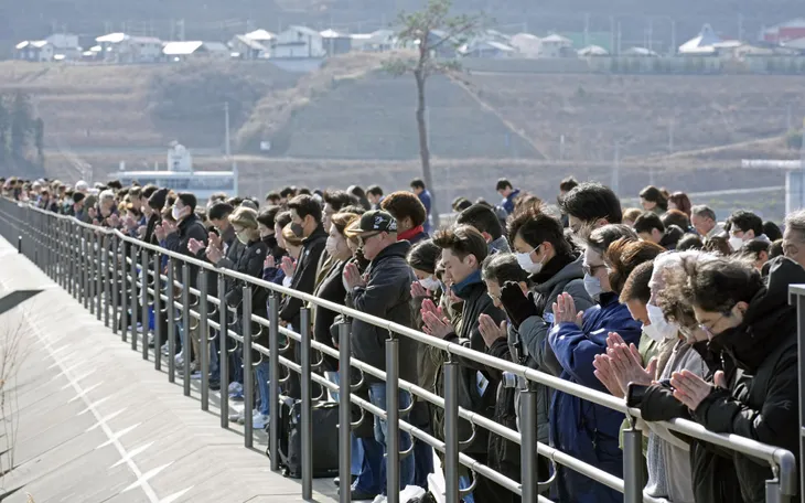 Người dân cầu nguyện trên con đê chắn sóng ở Miyako, tỉnh Iwate, Nhật Bản, ngày 11/3, tưởng niệm 15 năm thảm họa động đất - sóng thần (Ảnh: AP)