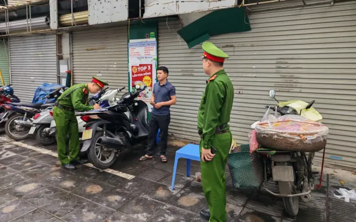 Lực lượng Công an phường Thanh Xuân, Hà Nội xử lý các vi phạm lấn chiếm lòng đường, vỉa hè.
