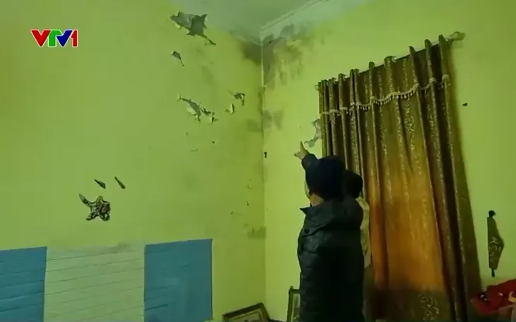 Tại gia đình ông Đỗ Hồng Quảng, cùng thôn, tầng hai của ngôi nhà hiện không còn được sử dụng để sinh hoạt do hầu hết các phòng đều xuất hiện vết nứt. Nước mưa thấm qua tường gây ẩm mốc, bong tróc, các vết nứt lan rộng cả khu vực cầu thang.