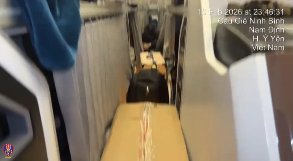 Trước đó, vào hồi 23h48 ngày 10/2/2026, tại Km 259 tuyến cao tốc Pháp Vân - Cao Bồ - Mai Sơn - QL45 - Nghi Sơn, tổ công tác thuộc Đội CSGT đường bộ cao tốc số 3, Phòng 6 Cục CSGT kiểm tra xe khách biển số 38H-053.xx, phát hiện xe chở quá số người quy định (39/35 chỗ) và để hàng trong khoang chở khách.