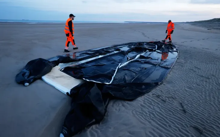 Thuyền hơi của người di cư bị cảnh sát Pháp chọc thủng tại bãi biển Gravelines, miền Bắc Pháp, ngày 22/12/2025 (Ảnh: AP)