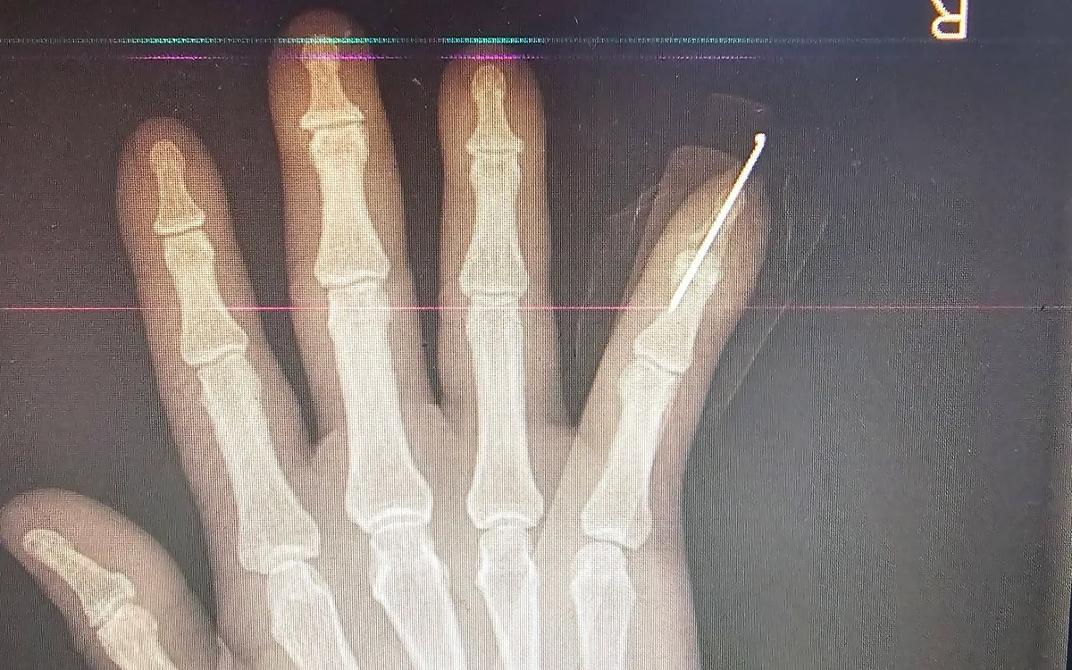 Bệnh nhân là nam giới, 63 tuổi, bị tôn cắt trong lúc làm việc. Khi nhập viện, bệnh nhân trong tình trạng đứt lìa hoàn toàn đốt 3 ngón V bàn tay phải, vết thương sắc gọn, nguy cơ cao mất chức năng bàn tay nếu không được can thiệp kịp thời. Ngay sau khi tiếp nhận, các bác sĩ nhanh chóng đánh giá tổn thương và chỉ định phẫu thuật vi phẫu cấp cứu.