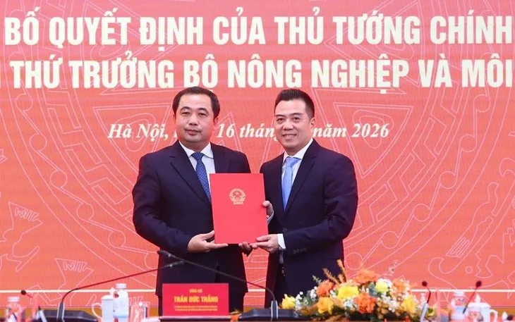 Bộ trưởng Bộ NN&MT Trần Đức Thắng chúc mừng ông Đặng Ngọc Điệp trong vai trò mới - Ảnh: VGP