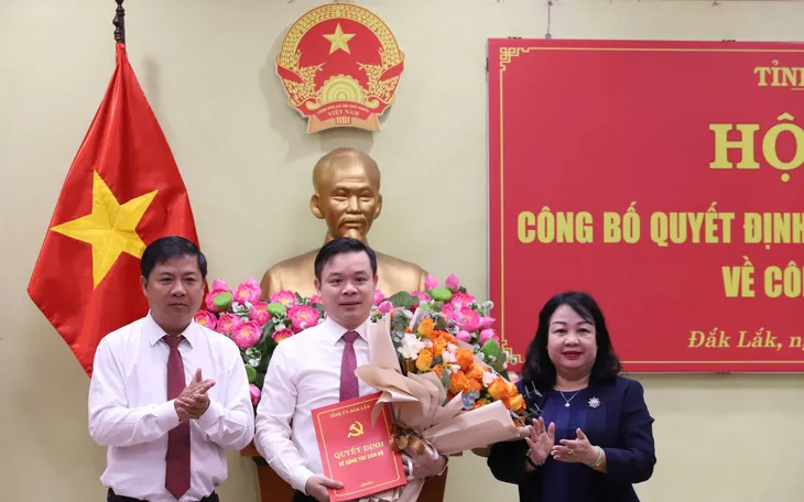 Ông Lương Nguyễn Minh Triết - Bí thư Tỉnh ủy Đắk Lắk (trái) và bà Cao Thị Hòa An - Phó bí thư Thường trực, Chủ tịch HĐND tỉnh - trao quyết định, hoa chúc mừng cho ông Đỗ Hữu Huy
