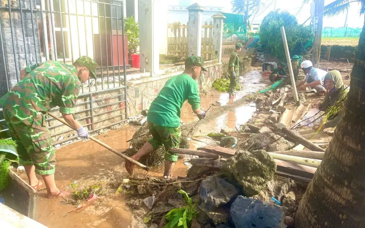 Cán bộ, chiến sĩ hỗ trợ người dân khắc phục hậu quả cơn bão số 13.