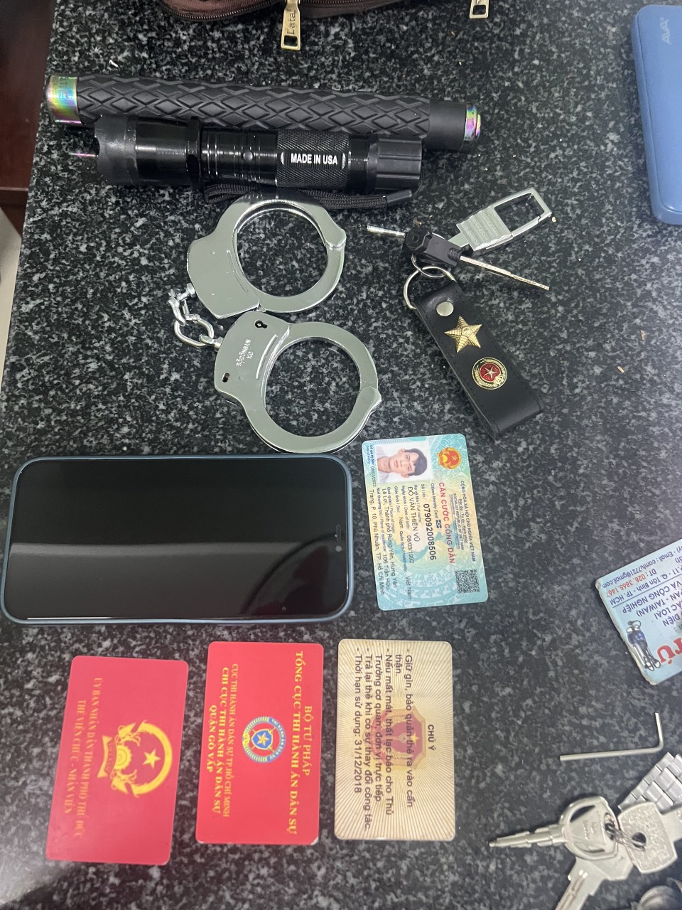 Qua làm việc đối tượng khai tên Đ.V.T.V (SN 1992, thường trú Q.Phú Nhuận, TP Hồ Chí Minh). Tiến hành kiểm tra, tổ công tác phát hiện, thu giữ: 01 gậy ba khúc; 01 đèn pin màu đen; 01 còng số 8 và 01 chìa khóa còng; cùng nhiều thẻ nhựa ghi tên viên chức – nhân viên làm việc tại các cơ quan nhà nước.