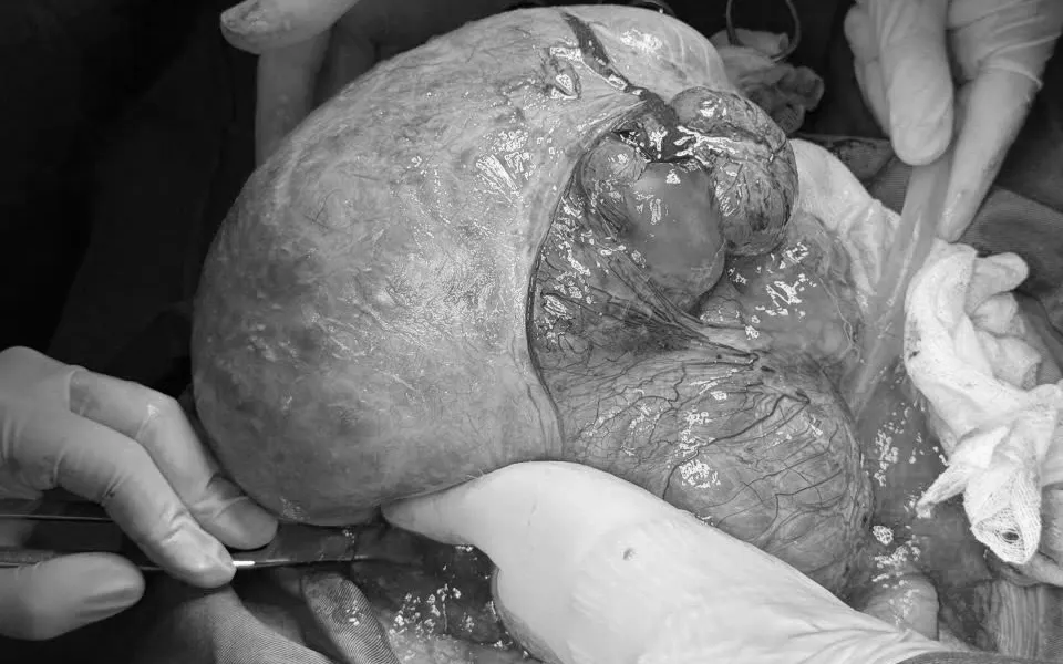 Bệnh nhân H.T.H. (78 tuổi) nhập viện với triệu chứng đau âm ỉ vùng bụng dưới, bụng to dần, ăn uống kém, nhanh no và mệt mỏi kéo dài. Kết quả thăm khám và chụp chiếu cho thấy khối u đường kính hơn 25cm, chiếm gần như toàn bộ ổ bụng, chèn ép nhiều cơ quan như ruột, gan, đại tràng và bàng quang.