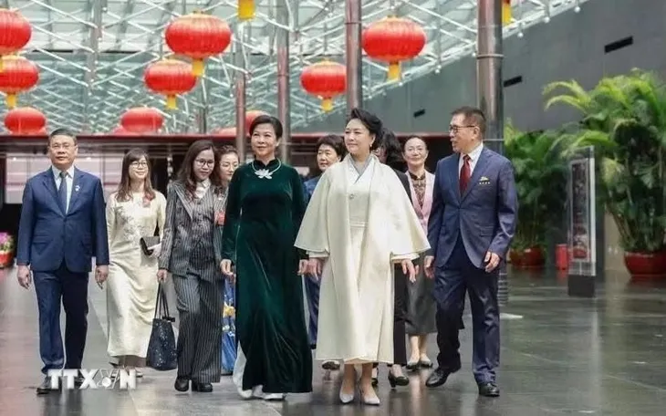 Hai phu nhân cùng nhau thăm Nhà hát lớn quốc gia Trung Quốc và có cuộc giao lưu, chia sẻ thân tình, cởi mở về các trải nghiệm thực tế cũng như việc giao lưu, phát triển văn hóa giữa hai nước. (Ảnh: TTXVN)