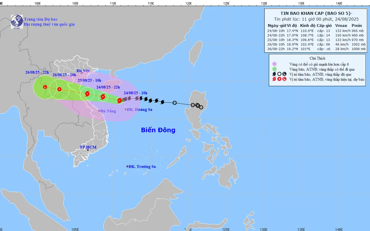 Dự báo đến 7h sáng mai (25/8) khi tâm bão đi vào phía Nam Vịnh bắc Bộ, cường độ sẽ mạnh lên cấp 12-13, giật cấp 15 và có thể còn mạnh thêm nữa. Khoảng trưa, chiều mai tâm bão sẽ đi vào đất liền khu vực Nghệ An đến Bắc Quảng Trị.