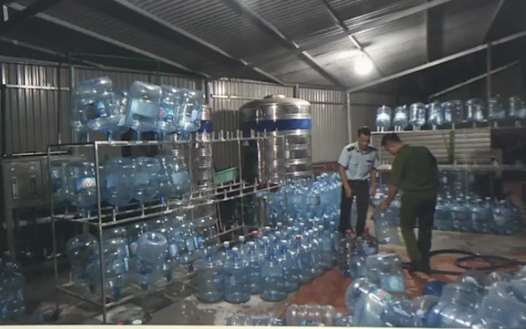 Những bình chứa được dán nhãn là nước tinh khiết của một thương hiệu nhưng thực chất chỉ là hàng giả, được bơm nước giếng khoan để bán cho người tiêu dùng. Thời điểm cơ quan công an và cán bộ quản lý thị trường của Cục Quản lý thị trường thành phố Hà Nội ập vào kiểm tra, các đối tượng vẫn đang trong quá trình sản xuất dang dở.