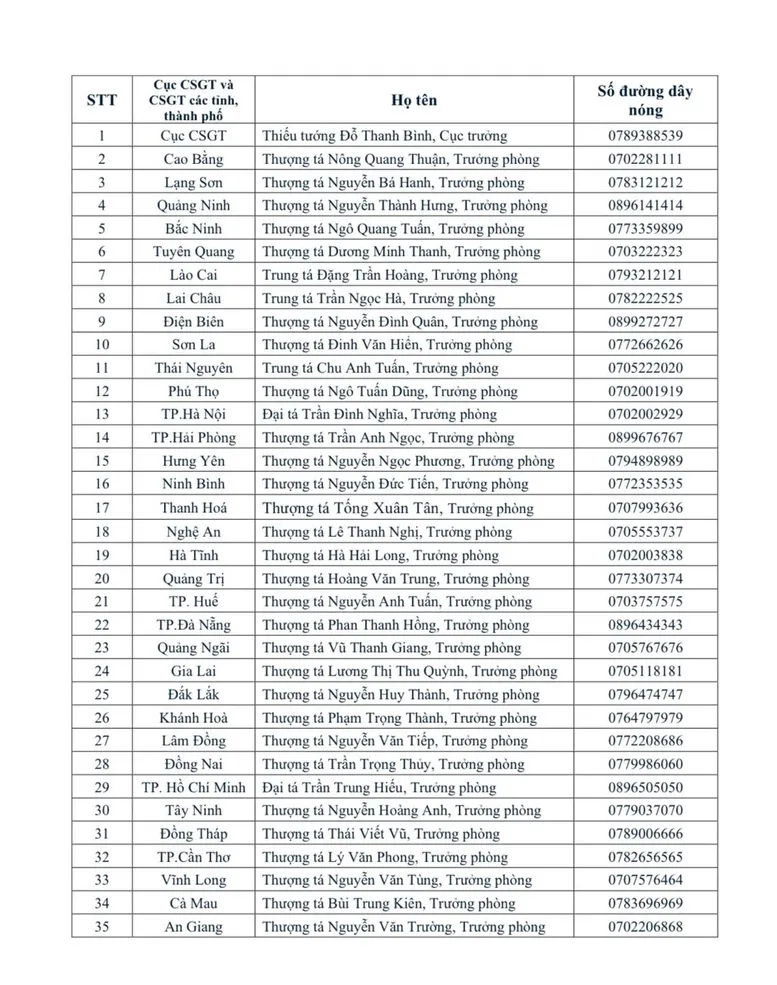Đại diện Cục CSGT cho biết, trong quá trình xử lý vi phạm, nếu phát hiện các trường hợp cán bộ chiến sĩ CSGT có biểu hiện tiêu cực, nhũng nhiễu, người dân có thể phản ánh qua các kênh tiếp nhận thông tin như: Số điện thoại đường dây nóng của đồng chí Cục trưởng Cục CSGT hoặc Trưởng phòng CSGT Công an các tỉnh, thành phố (ảnh dưới); fanpage Facebook Cục CSGT; ứng dụng VneTraffic.