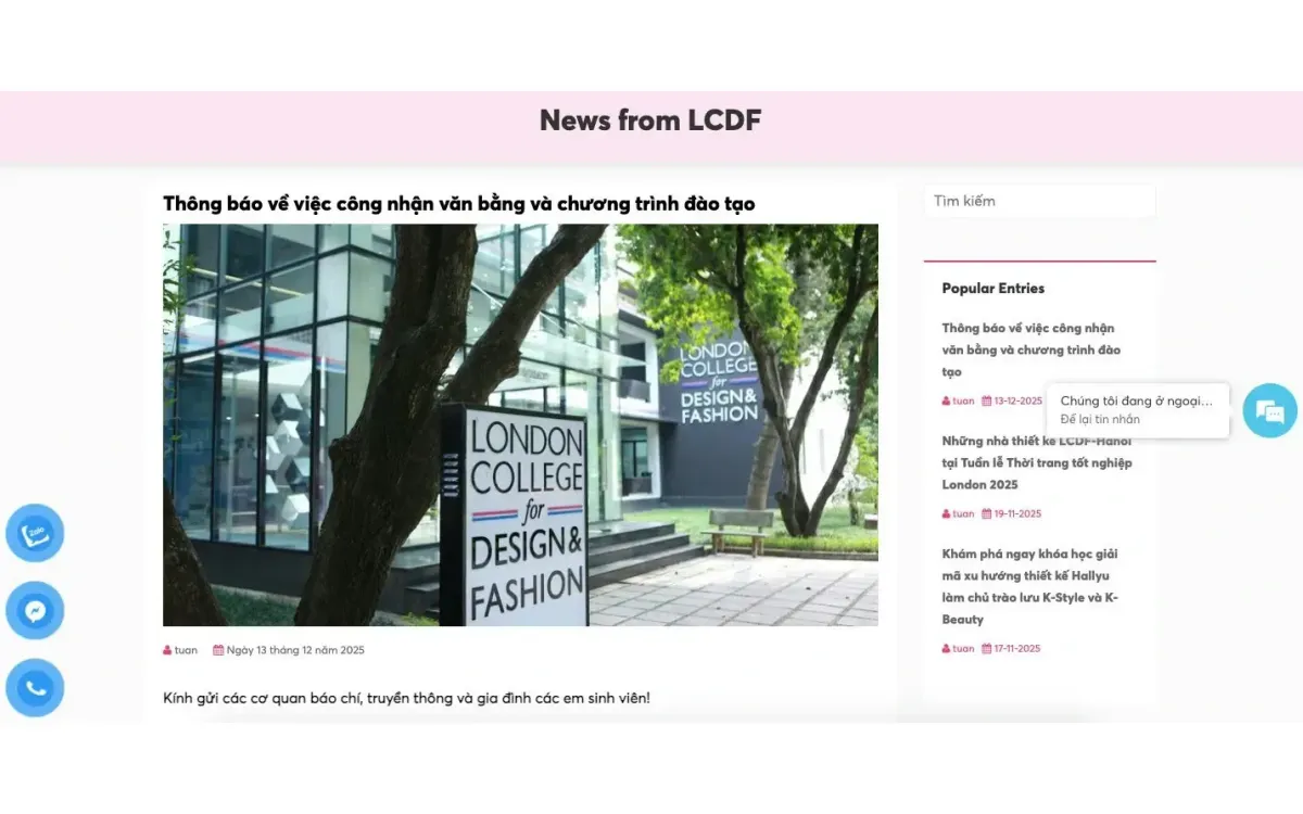 Trong thông báo ngày 12/12, Trường LCDF nói mình chỉ “giới thiệu” học viên cho đối tác nước ngoài. Ảnh chụp màn hình.