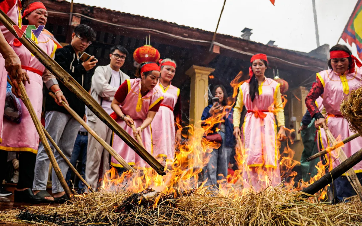 Sáng 24/2 (mùng 8 tháng Giêng năm Bính Ngọ) mưa xuân lất phất phủ ướt sân gạch đỏ đình làng Thị Cấm (phường Xuân Phương, Hà Nội). Khói rơm quyện hơi nước tạo thành một màn sương mỏng.