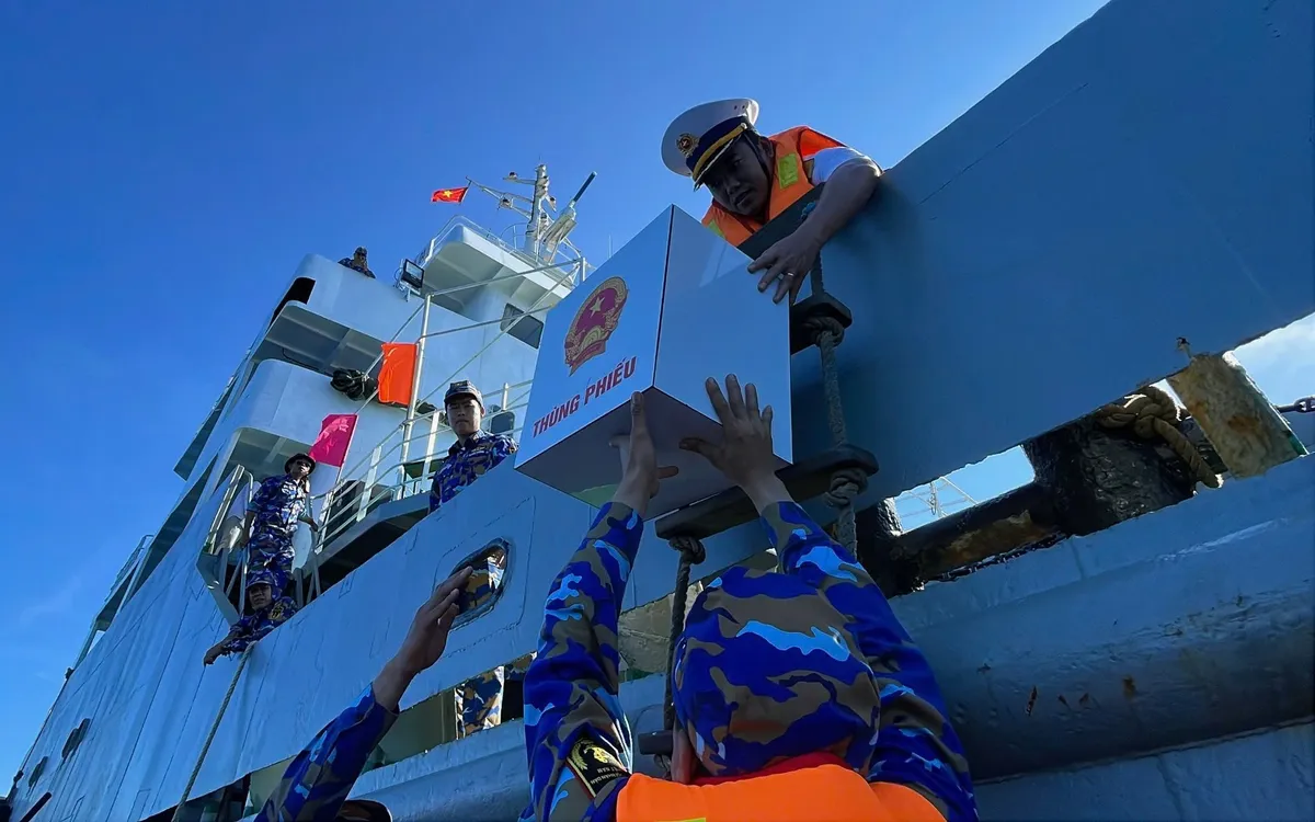 Tổ bầu cử thực hiện quy trình phát phiếu cho các cử tri tại nhà giàn.
